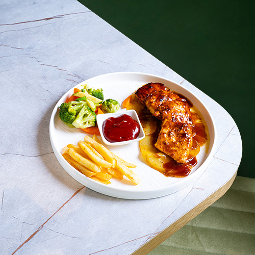 نصف دجاجة متبّلة بتوابل الباربيكيو المدخنة ومشوية حتى النضج. تُقدَّم مع بطاطا ودجز مقرمشة، صلصة الثوم الكريمية، وطماطم شيري مشوية لمذاق غني ومتوازن.