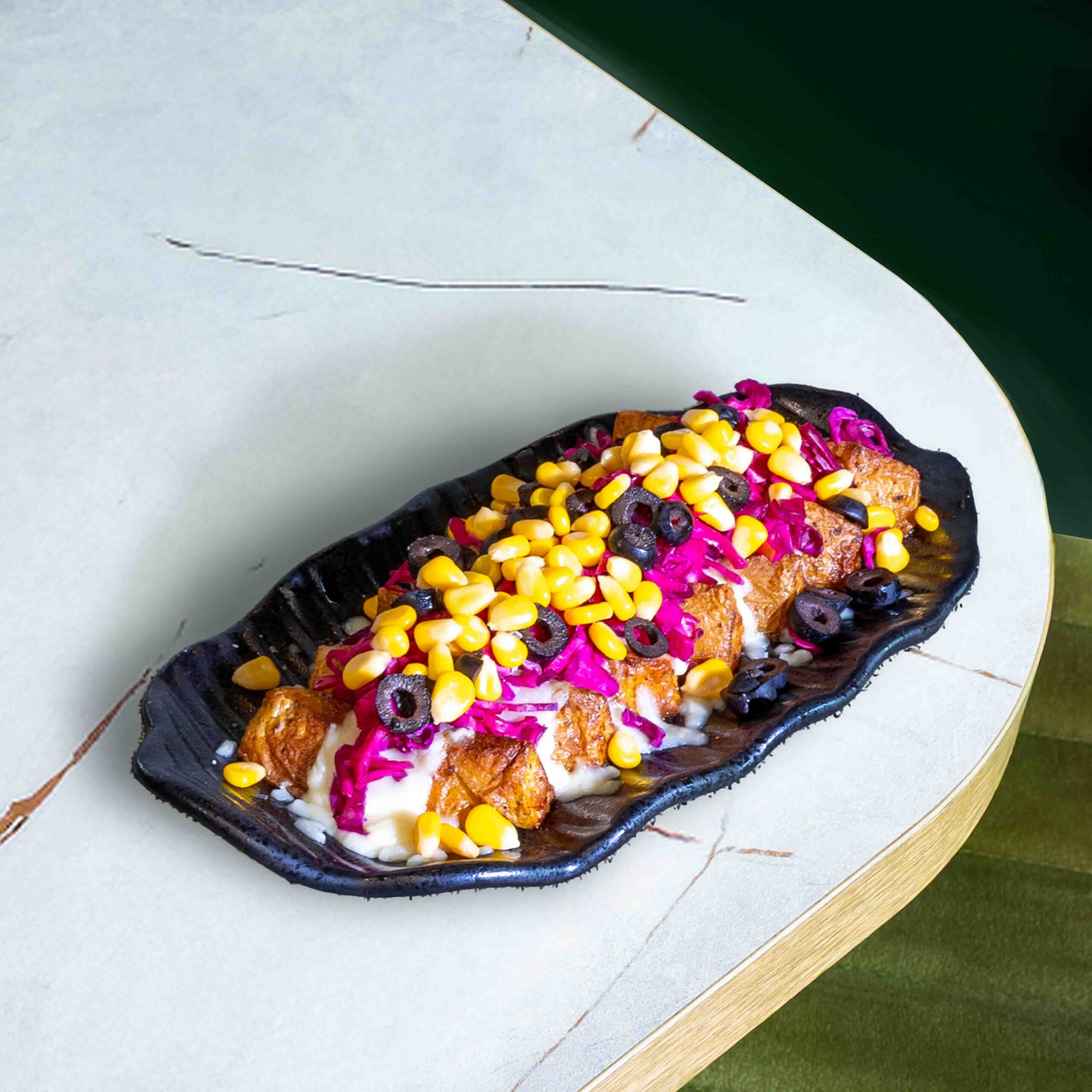 Baked potato wedges topped with melted mozzarella and cheddar sauce, served with corn, red cabbage pickles, and sliced olives.