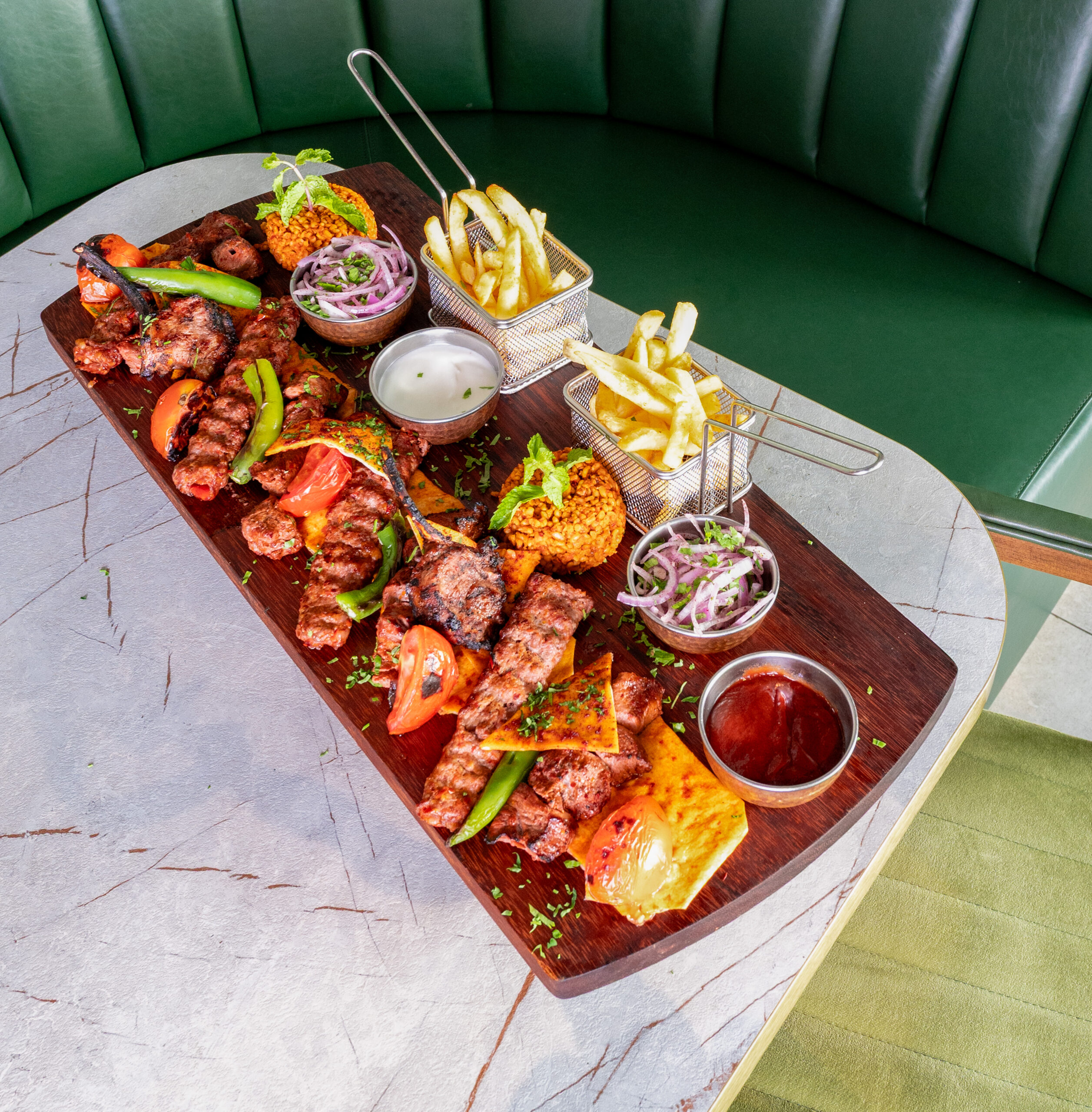 Selection of half kilo of chicken shish kebab, adana kebab, lamb shish kebab, lamb chops, grilled vegetables with bulgur rice and french fries.