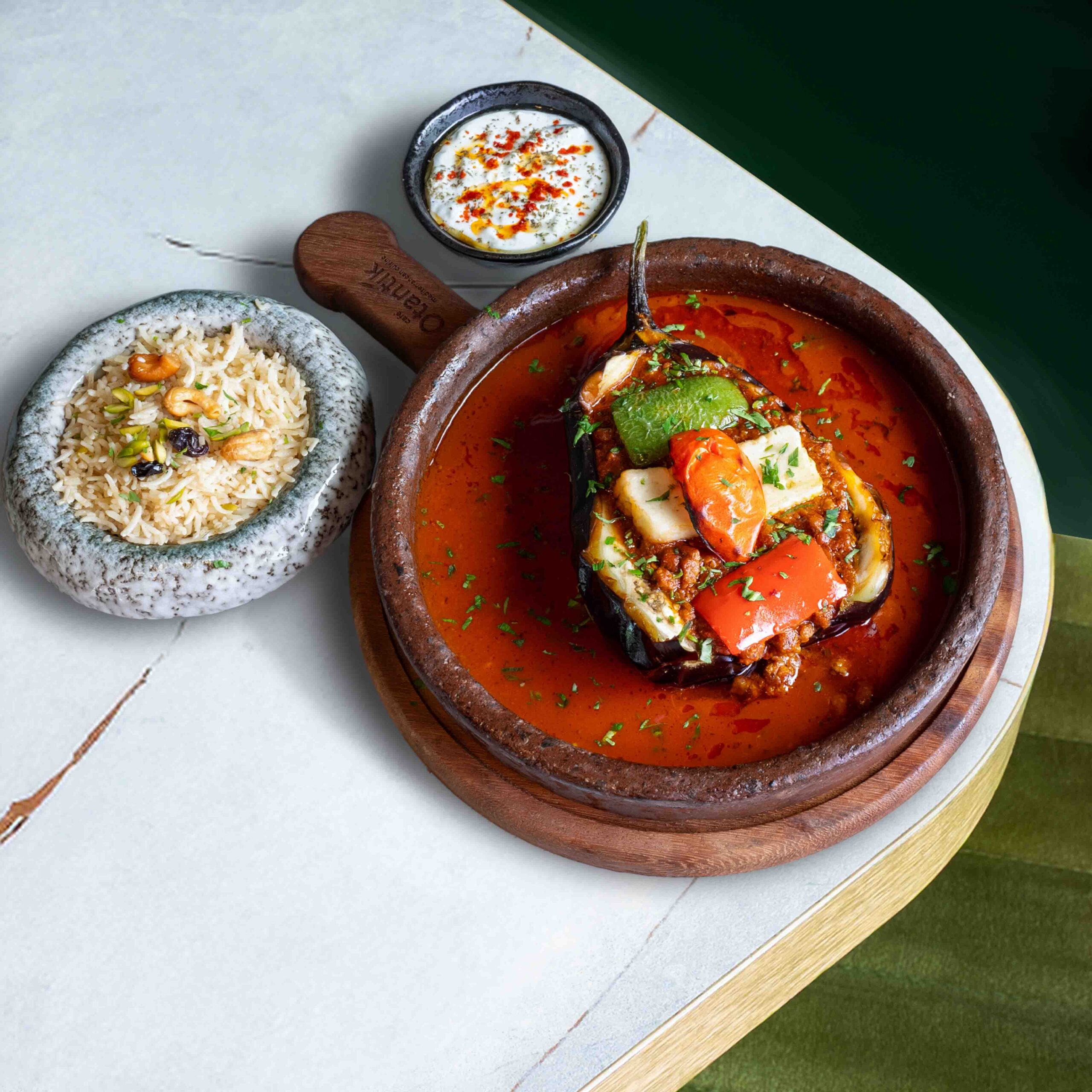 Fried eggplant filled with seasoned minced beef cooked in tomato sauce, topped with halloumi cheese and served with Turkish rice and tzatziki.