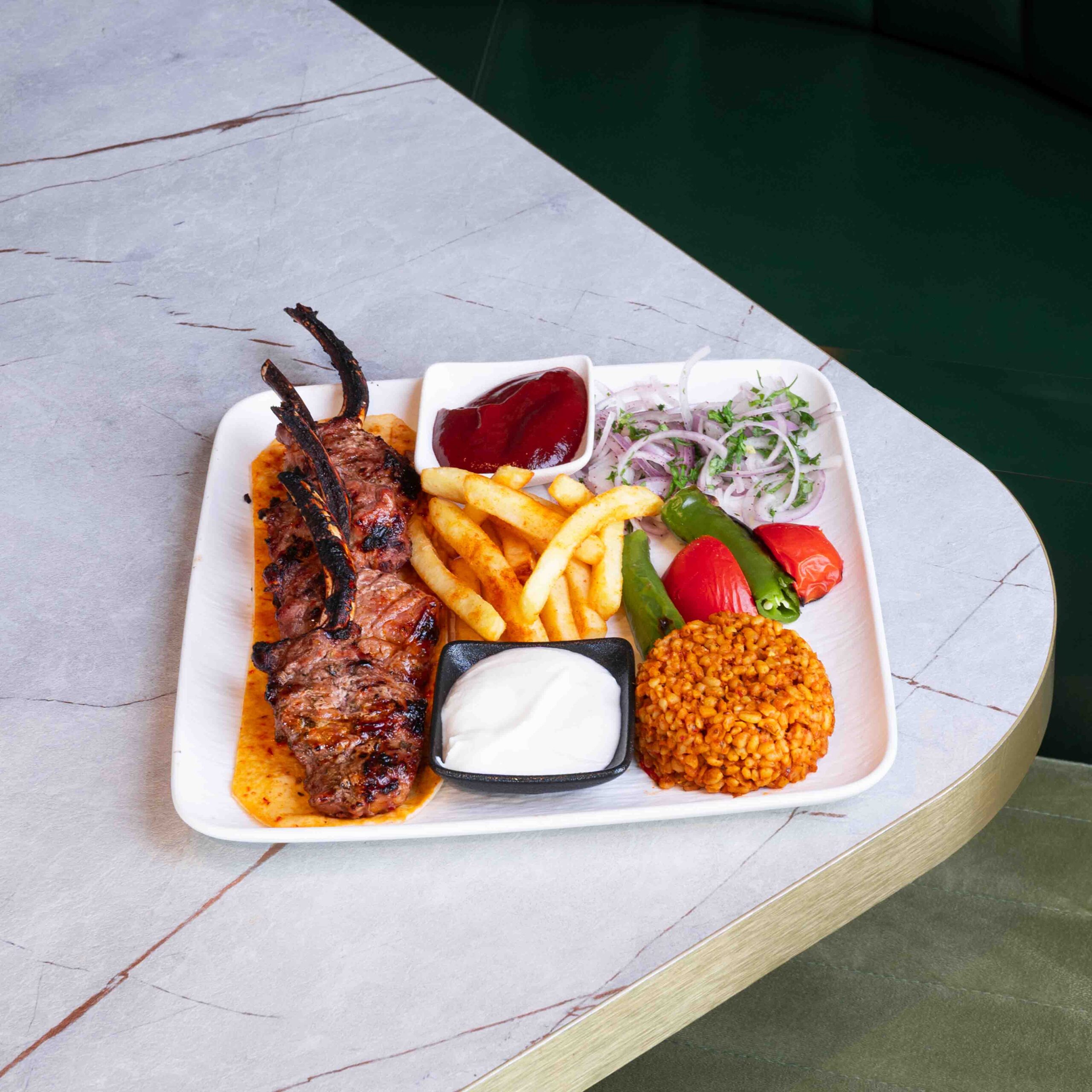 Grilled lamb chops served with bulgur and French fries